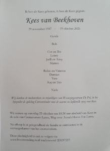 Het bestuur ontving bericht dat Kees van Beekhoven is overleden.