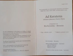 Met verdriet hebben wij kennisgenomen van het overlijden van Ad Kerstens.